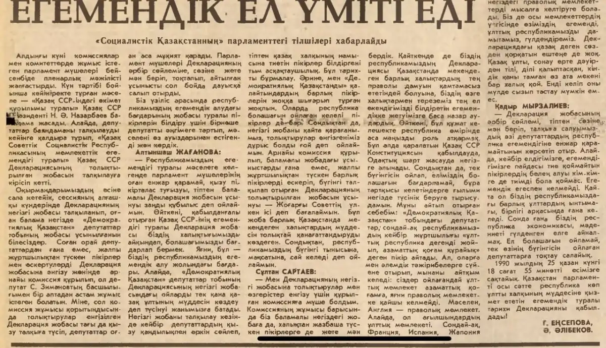 Сол нөмірде жарияланған «Егемендік ел үміті еді» мақаласын парламент тілшілері Г. Еңсепова мен Ә. Әлібеков жазған. Олар депутаттардың пікірін тірі сөзбен жеткізген: