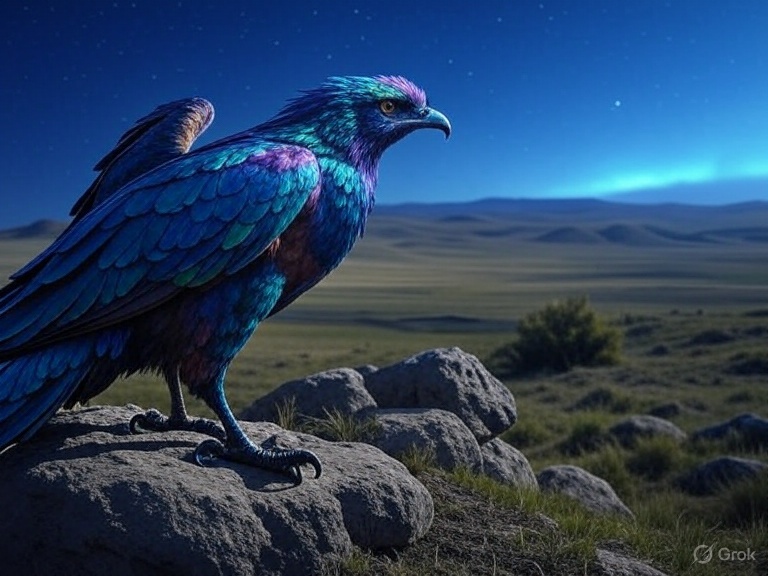 Самрук (самырұқ) — священная птица, откладывающая золотое яйцо, символизирующее солнце, на вершине мирового древа Байтерек. Это древо соединяет небо, землю и подземный мир, а его корни охраняет Айдахар. Эти образы воплощают космический порядок и равновесие.