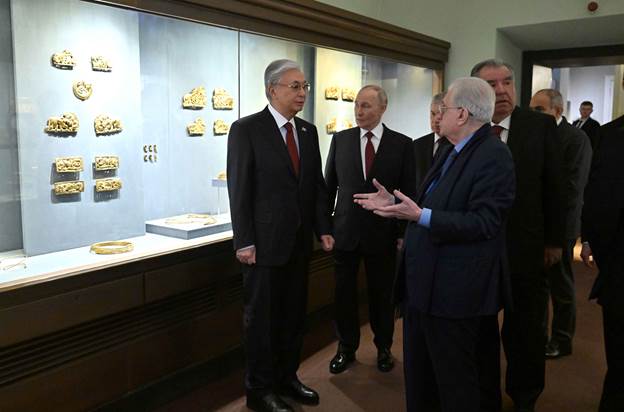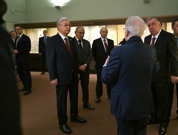 Президент Касым-Жомарт Токаев и руководители стран СНГ, прибывшие в Санкт-Петербург на неформальный саммит, посетили Государственный Эрмитаж. В музее для высоких гостей провели экскурсию.