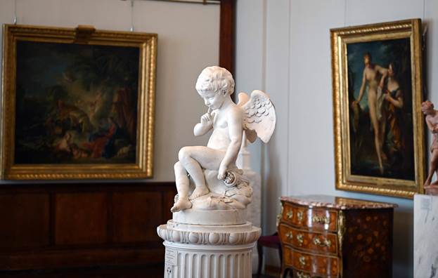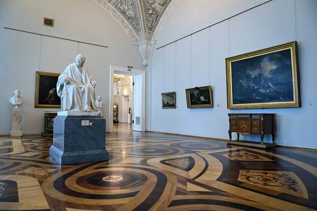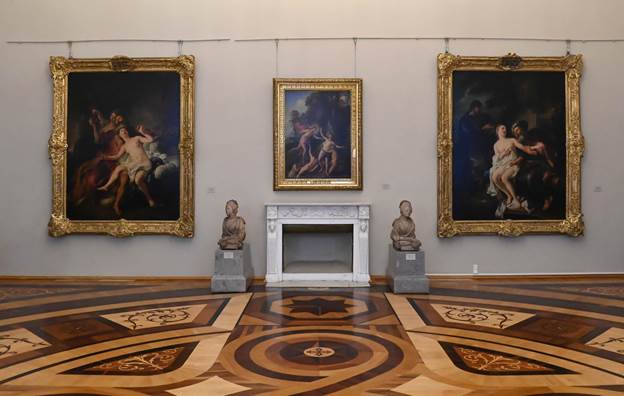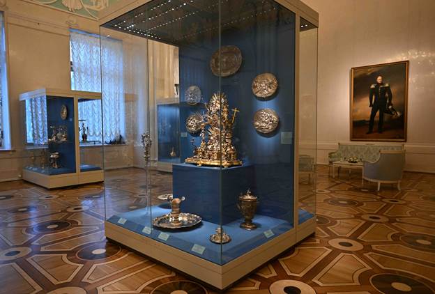 Главы государств осмотрели знаковые экспозиции, размещенные в Александровском зале, Зале искусства Франции XVIII века. Особое внимание было уделено уникальным коллекциям «Золотой кладовой», где хранятся археологические находки из драгоценных металлов, а также парадным интерьерам исторических помещений – Пикетного и Гербового залов. Высокие гости также ознакомились с другими экспозициями и залами музея, составляющими его всемирно известное собрание.