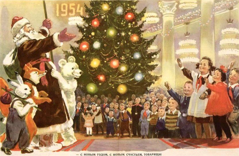 После войны и в послевоенные годы Новый год стал главным советским праздником. В регионах республики, где горожан было меньше, люди отмечали его скромнее: устраивались только школьные утренники и вечера в домах культуры, а в райцентрах открывались ярмарки новогодних товаров. Однако даже там дети верили в волшебство: они наряжали простые елки в доме, делали бумажные гирлянды и получали подарки с мандаринами и шоколадом. Вечером всей семьей садились за стол и включали телевизор: по традиции шел «Новогодний Голубой огонек» и праздничные концерты. Обращение первого секретаря республики и центральных теле- и радиоканалов к советскому народу смотрели всей семьей.
