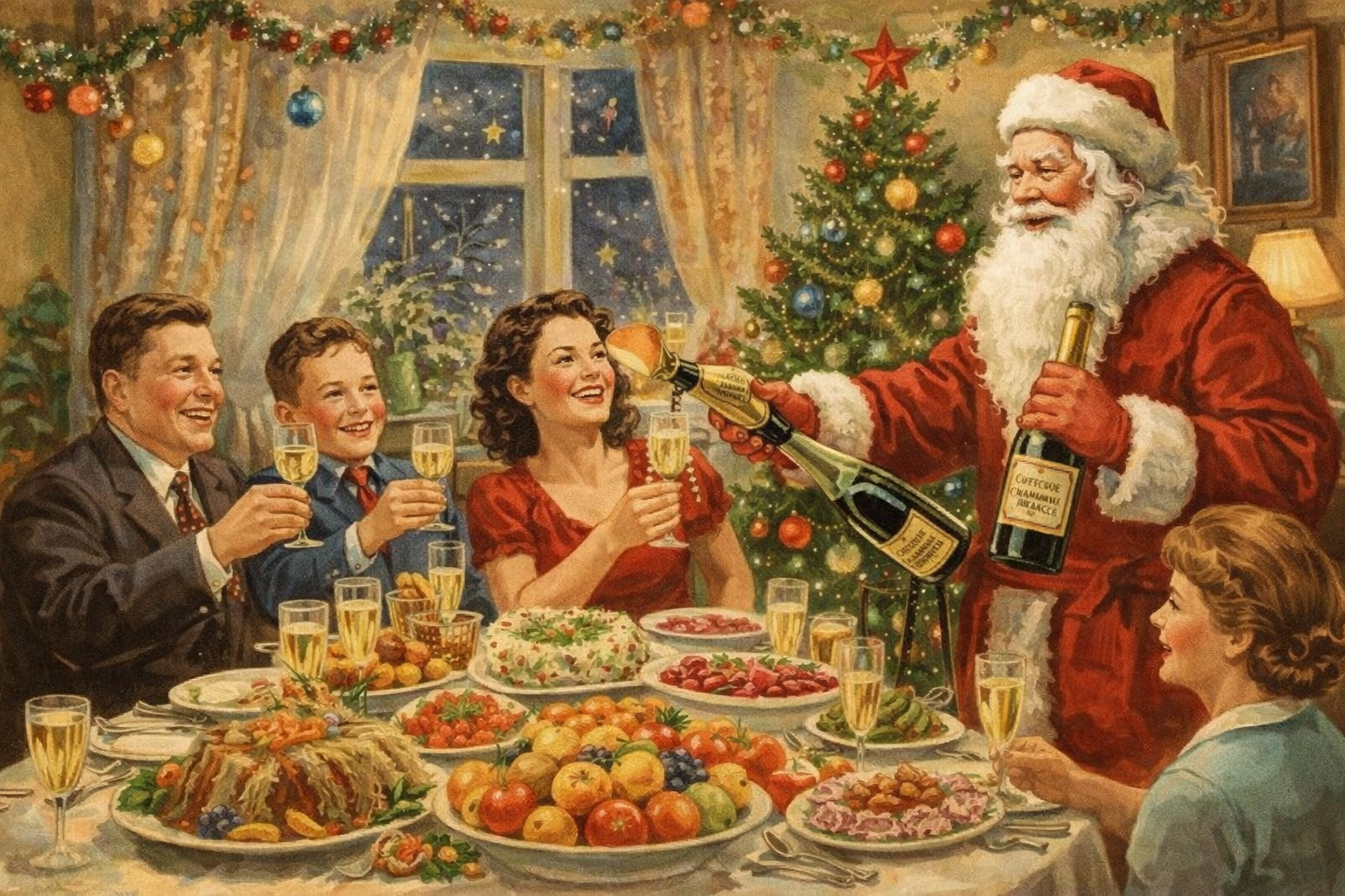Дед Мороз навещал и взрослую компанию: рестораны и клубы проводили новогодние балы-маскарады. В газетах того времени печатались афиши: «Новогодний бал в ресторане - джаз, танцы, конфетти и угощения!». Столы ломились от блюд: «Оливье», «Сельдь под шубой», студень, соленая и копченая рыбка, овощи и фрукты, а запивали все это «Советским шампанским». В ресторанах предлагали призы за лучшие костюмы, а взрослые пили напитки, создавая ощущение большой праздничной роскоши. Многие семьи тоже устраивали богатый ужин дома и украшали каждый уголок.