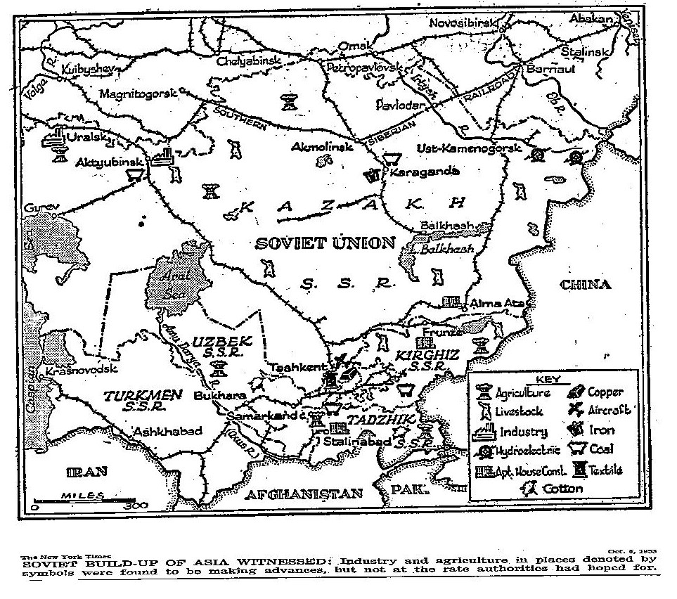 "Зафиксировано наращивание потенциала Советской Азии; промышленность и сельское хозяйство в местах, обозначенных символами, продвигались вперед, но не такими темпами, на которые рассчитывали власти”