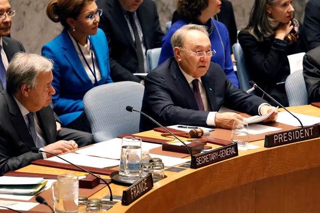 Нурсултан Назарбаев выступает на заседании Совета Безопасности ООН (Нью-Йорк, 2018 г.), посвященном вопросам нераспространения оружия массового уничтожения и укрепления глобальной безопасности.