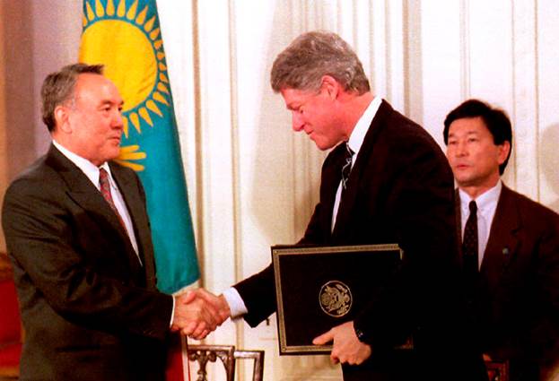 Президент США Билл Клинтон пожимает руку президенту Казахстана Нурсултану Назарбаеву, который только что подписал Договор о нераспространении ядерного оружия в Белом доме 14 февраля 1994 года.(Photo credit: Luke Frazza/AFP/Getty Images)
