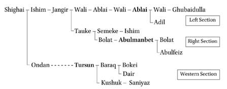 Затем Джин Нода обращается к тому, как сами казахи могли понимать эти три «подразделения». Здесь центральной фигурой становится султан Даир, зять Абылая. После смерти Абылая в 1781 году среди казахской знати началась борьба за то, кто займет его место. Даир потребовал, чтобы именно он унаследовал ханский титул. Он отправил своего посланника в Или и заявил, что после смерти Абылая среди казахов нет достойных старейшин, кроме него, а сам Абылай будто бы перед смертью завещал ему заботу о степи. Посланник Даира говорил, что у казахов изначально было три хана: Барак, Абулмамбет и Абылай, но все они умерли, и теперь единственный подходящий человек — Даир. То есть Даир строил свою претензию сразу на двух основаниях: на родстве с Абылаем и на принадлежности к важной генеалогической линии. Но цинский военный губернатор Или отклонил его требование. Он ответил примерно так: мы не знаем, когда и как твой отец Барак стал ханом, а значит, титул Абылая по разуму должен перейти сыну Абылая — Вали. И действительно ханский титул признали за Вали.