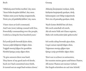 Наряду с этим первым аргументом, согласно которому многочисленные различия легко объясняются устной природой текста, существует и второй: рукопись Мартина и транскрипция Радлова часто демонстрируют поразительное сходство, включая длинные отрывки почти дословных совпадений. Помимо различий в языковой реализации, наблюдается почти дословное совпадение: