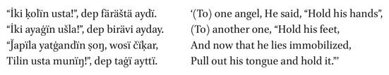 Царь попытался подкупить Азраила: «У меня бесчисленные богатства, 16 000 рабов. Возьми их всех, только укрась запись моих деяний!». Но ангел не был впечатлен: «Свяжите его, утащите и бейте. Нам не нужны твои богатства и рабы, нам нужен ты». Затем последовала процедура, которая была «еще более болезненной, чем когда тебя рубит собственный отец, мучительнее, чем если бы тебя варили в тысяче котлов». Затем явились ангелы и стали спрашивать царя: «Какова твоя вера и твои грехи? Кто твой Господь и твой пророк? Какова твоя религия?». Царь снова попытался выкрутиться, но это оказалось напрасным, поскольку, к его ужасу, выяснилось, что ангелы вели учет всех его деяний, как добрых, так и дурных, от рождения до смерти. Затем появился другой ангел: его верхняя губа подпирала небо, а нижняя — землю, его ноги находились в аду, а изо рта вырывалось адское пламя, и он схватил царя. Царь был закован в цепи за шею и приведен к Богу. Его последняя мольба о прощении также оказалась напрасной, и «змея размером с верблюда» впрыснула свой яд, и раздался голос Бога: «Схватите его душу и бросьте в ад». Далее следует яркое и довольно подробное описание топографии ада, включая его семь адов, каждый из которых предназначен для определенной категории грешников, и каждый подвергается особому виду наказания. В тексте описывается - Хавия, первый ад, обитель «воров и прелюбодеев»; Сакар, второй ад, обитель «тех, кто не постился и не молился»; Джаханнам, третий ад, обитель «тех, кто заставлял своих родителей плакать»; Сиджил, четвертый ад, обитель «тех, кто совершал позорные поступки за спиной других»; Нукла, пятый ад, обитель «бахши и одержимых»; Захра, шестой ад, обитель «ленивых, не совершающих молитву»; и Джаханнам, седьмой ад, обитель «неверных, не следующих сунне».